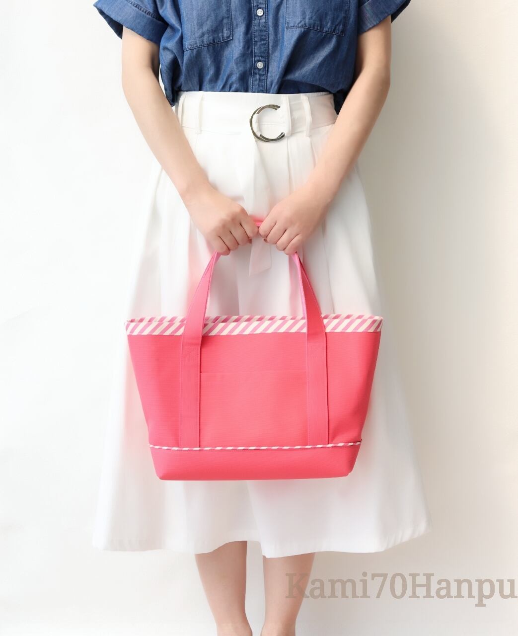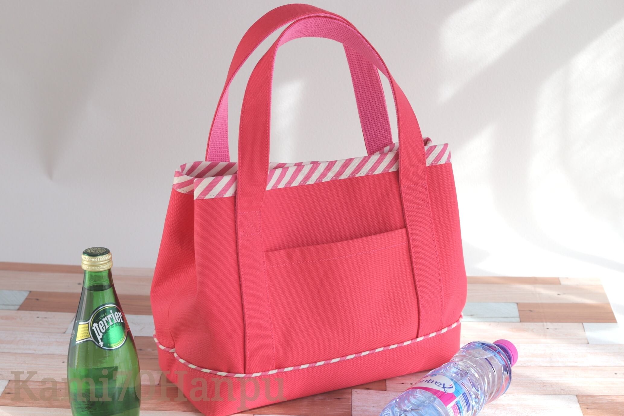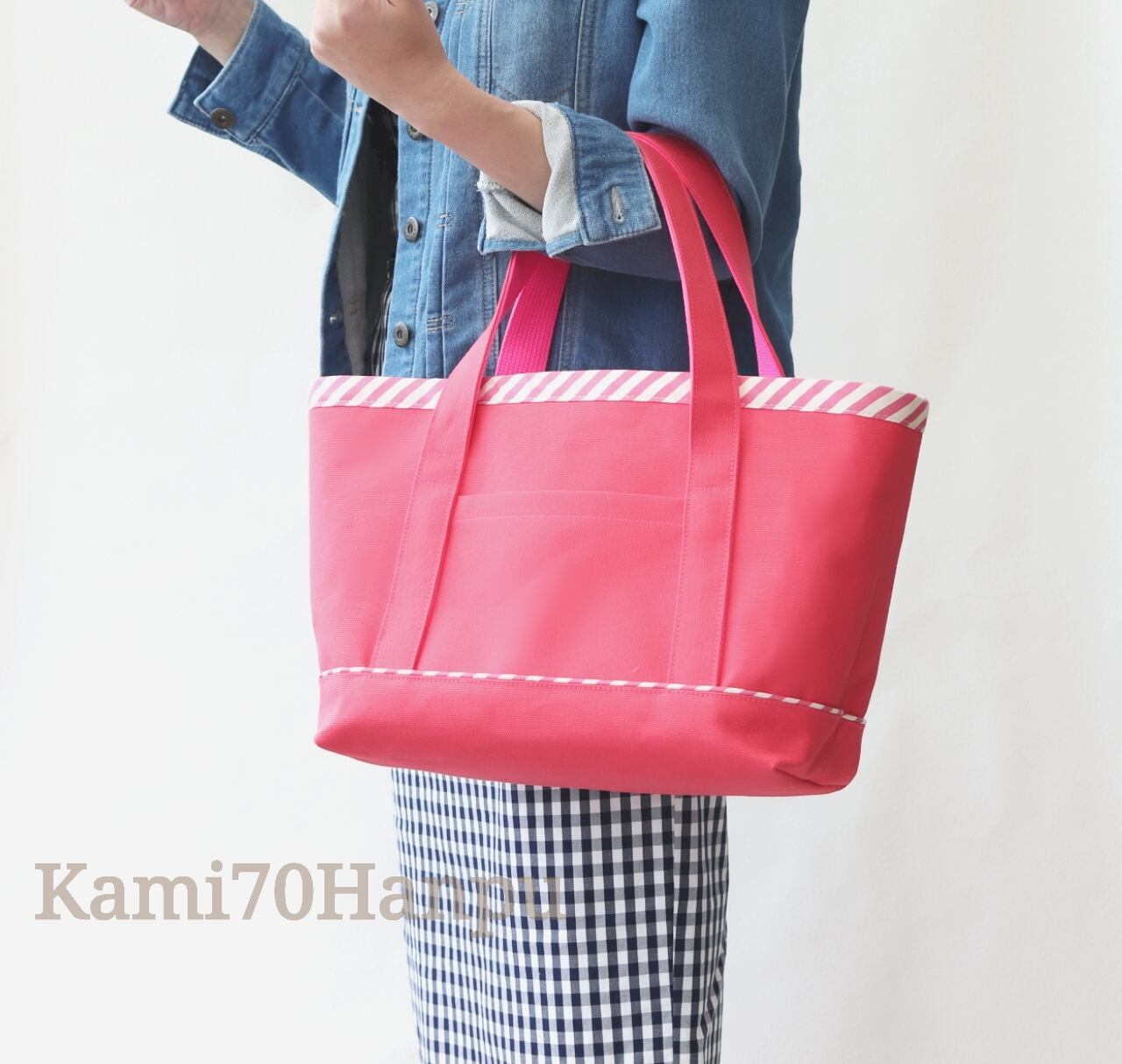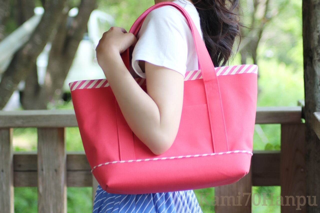 濃いピンクの帆布に斜めストライプのデザインがポイントです。