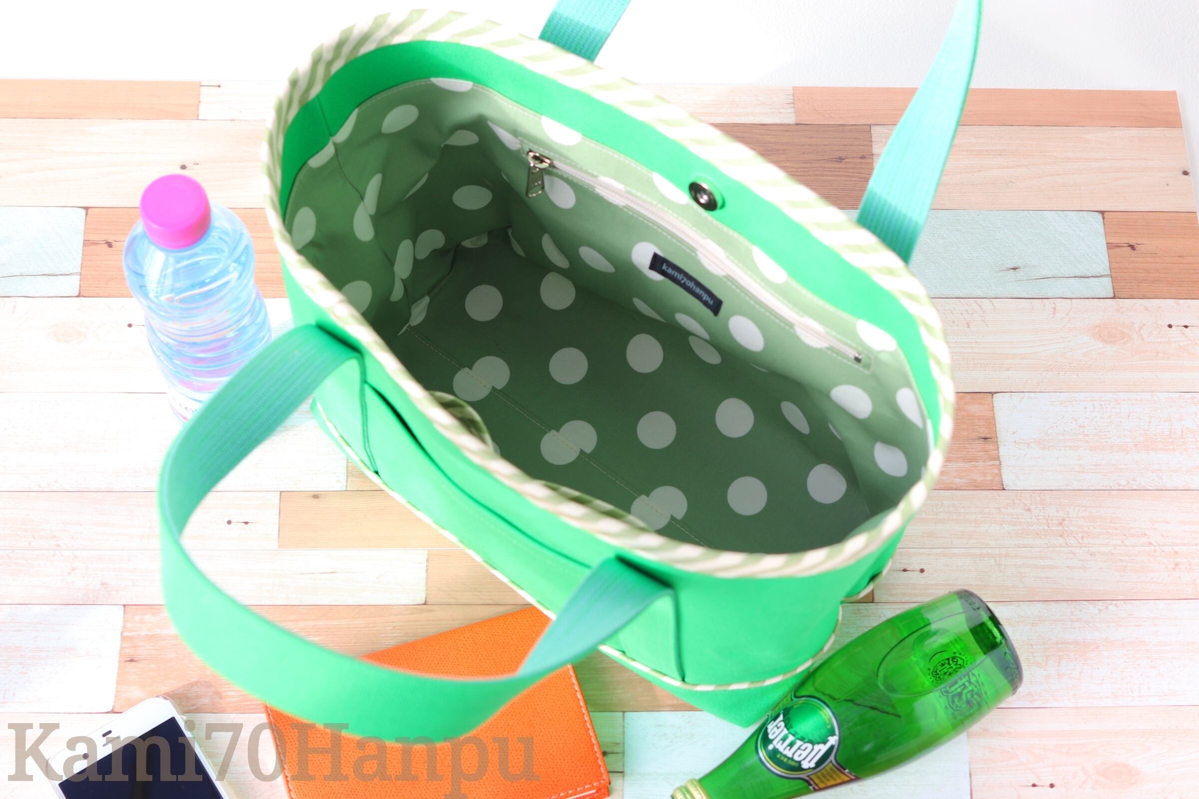 鮮やかなグリーンはシンプルな服装にもよく映え、バッグの切り替え部分に一周した斜めストライプの玉(パイピング)が目を引きますので、きっとお出かけも楽しくなると思います♪