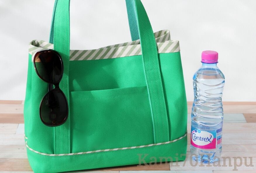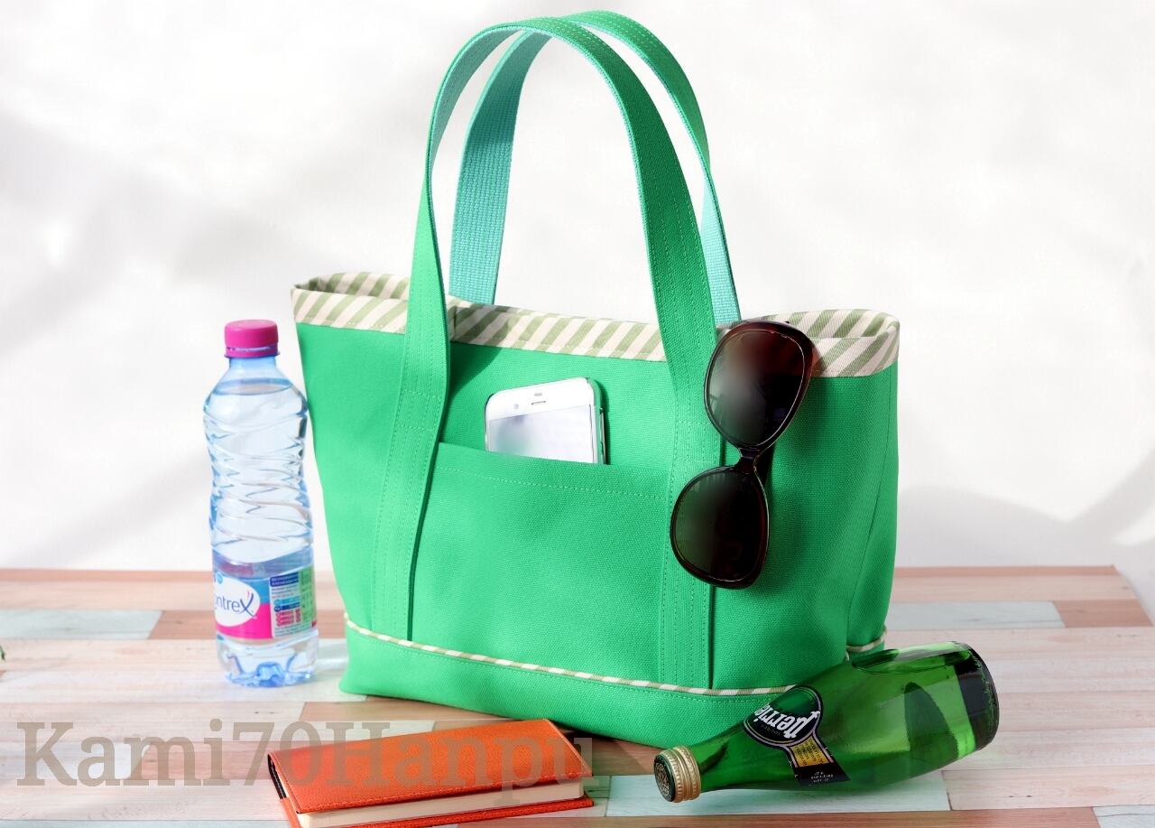 カラフルなグリーンの帆布に斜めストライプのデザインがポイントです。
