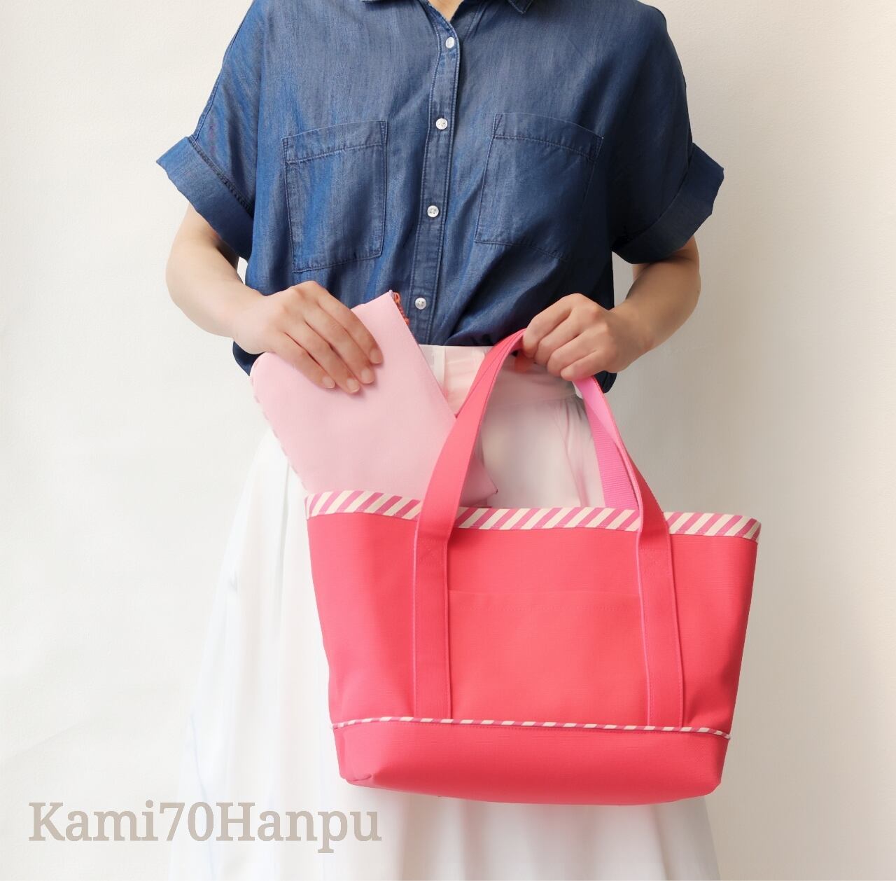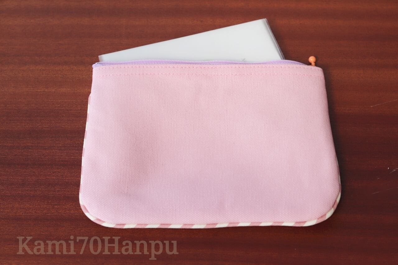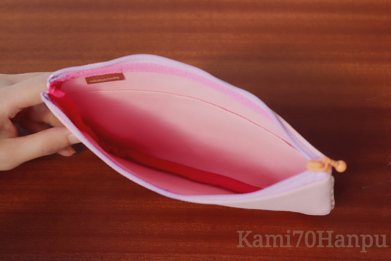 【カラー】本体:サクラ色 ファスナー:パステルパープルの生地にオレンジの引き手
